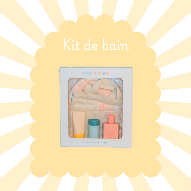 Kit de bain pour poupée comprenant 3 accessoires en silicone, une cape de bain et un sac de transport.